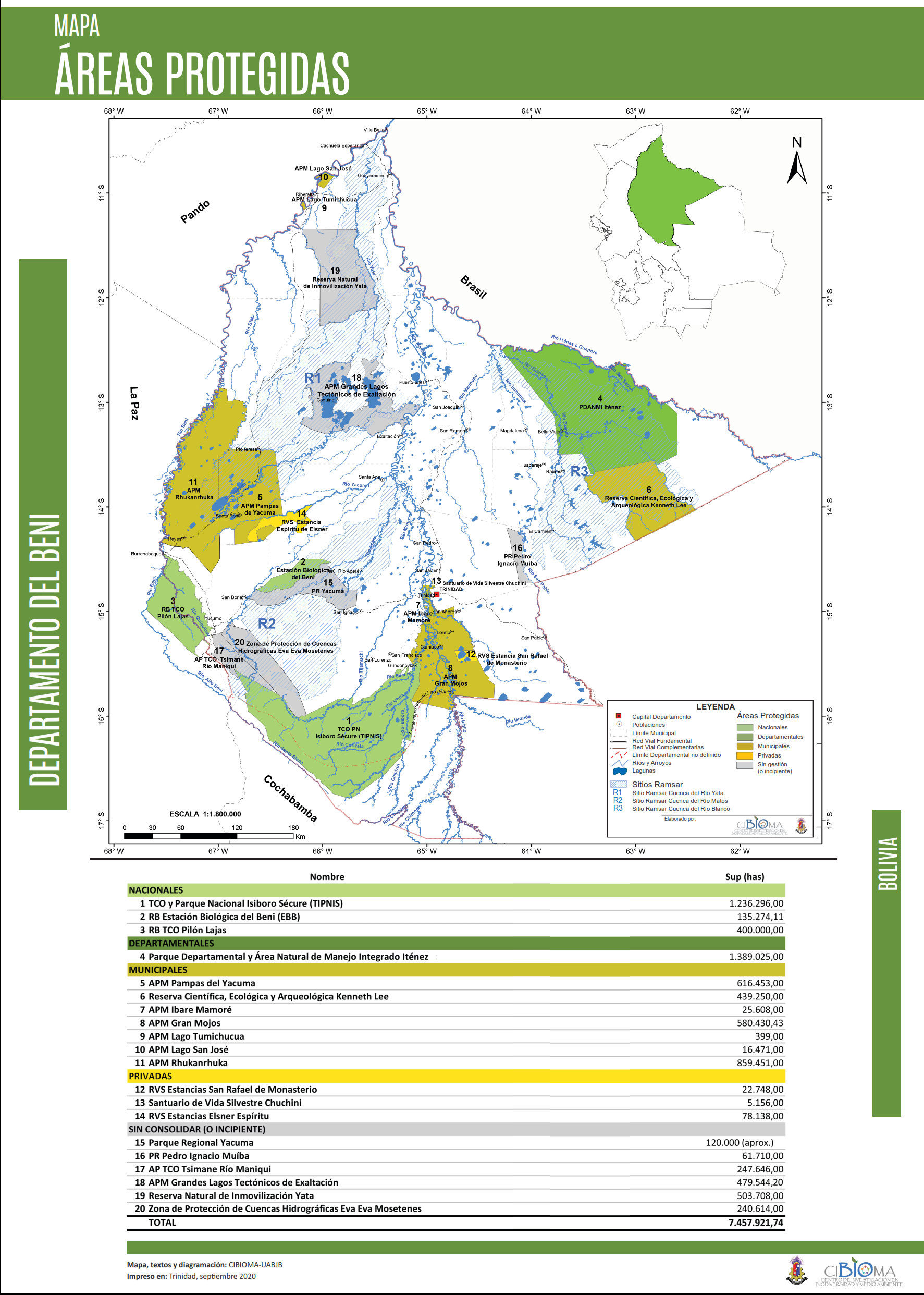 | Elaboración del Mapa Informativo de las Áreas Protegidas del Departamento del Beni. Bolivia. 2016. CIBIOMA-UABJB, GOBE, PacsBio-UE. |